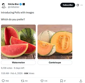 As you can see in this example posted by X’s Head of Product Nikita Bier (and viewed on desktop), you can now add large images to each of your X poll questions, which will provide more context for people to vote on.