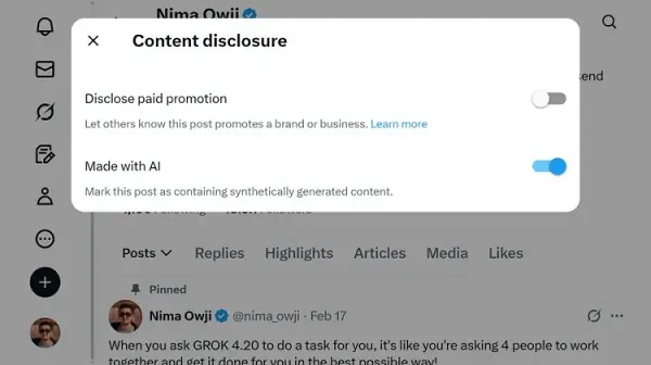 X already adds watermarks to images and videos that have been generated by its proprietary Grok chatbot, in order to clarify that the content is AI-generated. But there’s no requirement, at this stage, to include this disclosure within X posts. And with more and more developers looking to flood X with AI-generated content, X’s head of product Nikita Bier has noted that this is a significant concern, which seems to point to the development of this new AI disclosure toggle.