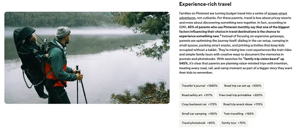 The report highlights seven key parental usage trends in the app, showcasing how parents are using Pins for “thoughtful parenting” guidance, which includes planning vacations and creating more engaging at-home activities.