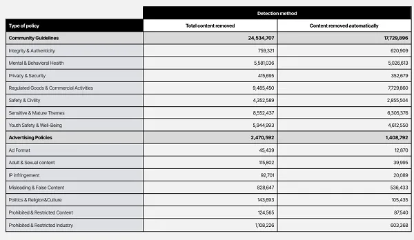 In terms of youth safety, TikTok is removing more posts for related violations, while it’s also taking a more proactive approach to mental and behavioral health reports. In both areas, TikTok’s automated detection of violations has improved significantly since it began reporting these numbers.