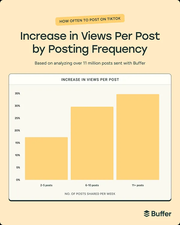According to Buffer’s data, posting more often leads to more views per post, with TikTok’s algorithm seemingly rewarding consistent activity.