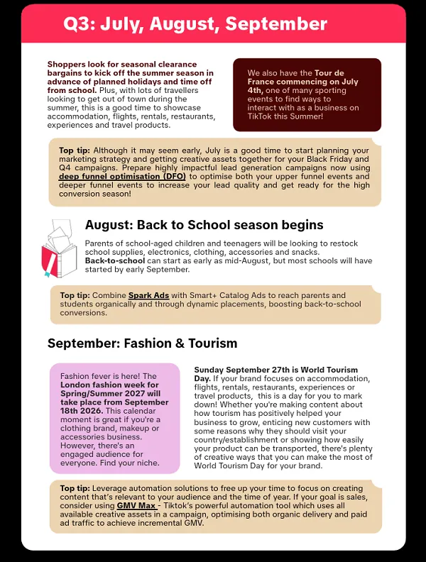 As you can see in this example, TikTok’s event calendars provide an overview of key seasonal considerations, as well as notes on which TikTok advertising tools are best suited to assist in capitalizing on these events.
